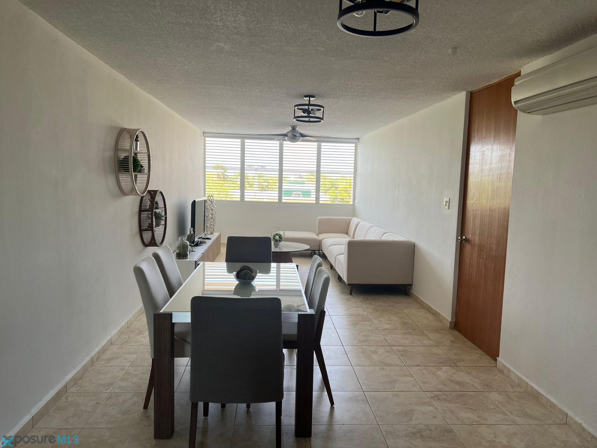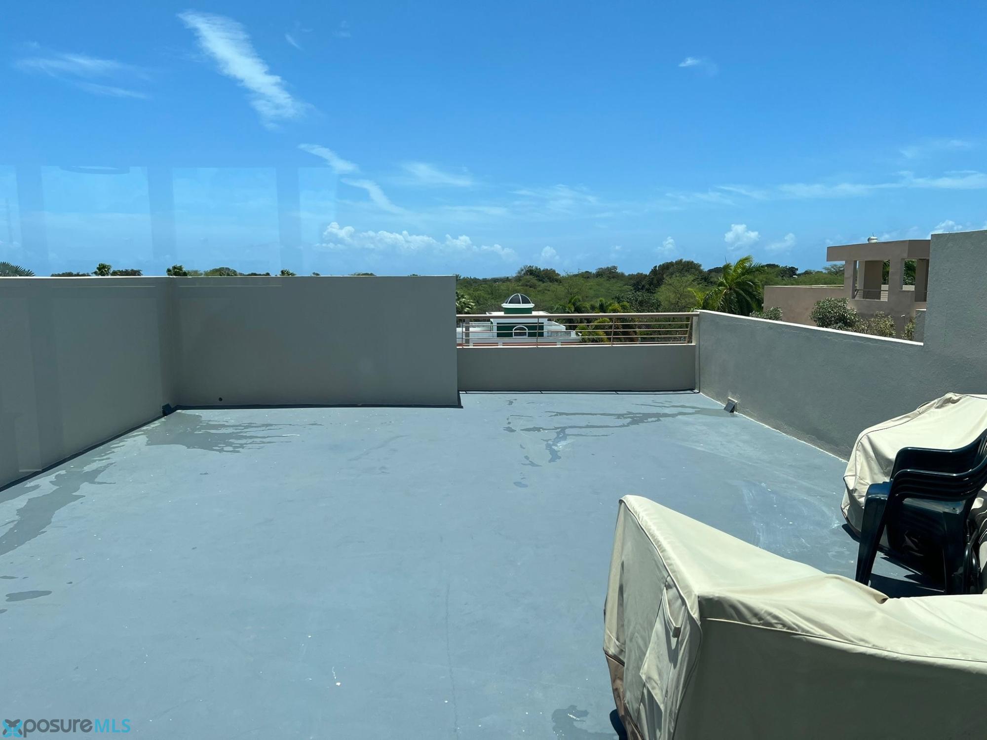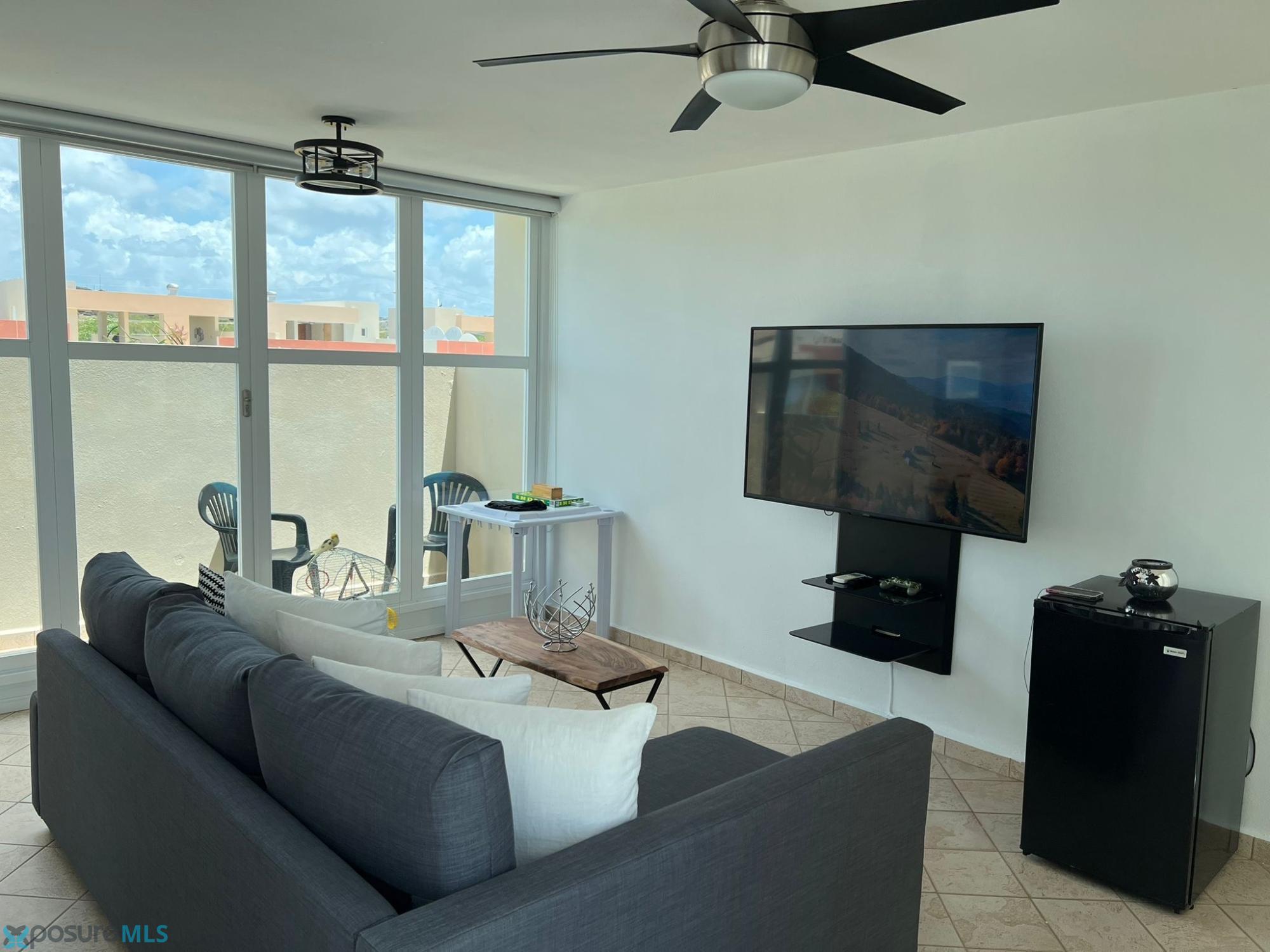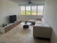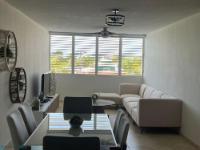 This beautiful two-story penthouse apartment is available for rent. It features a living room, dining room, modern kitchen, two bedrooms, two and a half bathrooms, a laundry area, and a balcony with a spiral staircase leading to the second floor. The second floor includes a family room/game room, a half bathroom, a small kitchen cabinet with a sink, another balcony, and a spacious open terrace with a great view of the complex and common areas. This penthouse apartment can be rented furnished or unfurnished. It comes equipped with air conditioning in all bedrooms, the living room, kitchen, dining room, and family room, as well as ceiling fans and light fixtures. Included items are a stove, refrigerator, microwave, living room set, dining room set, bedroom sets, sofa bed, and TVs. A beautiful place to live. Located in Condominio Paseo del Faro, Carretera 301 km 7.3, Combate..