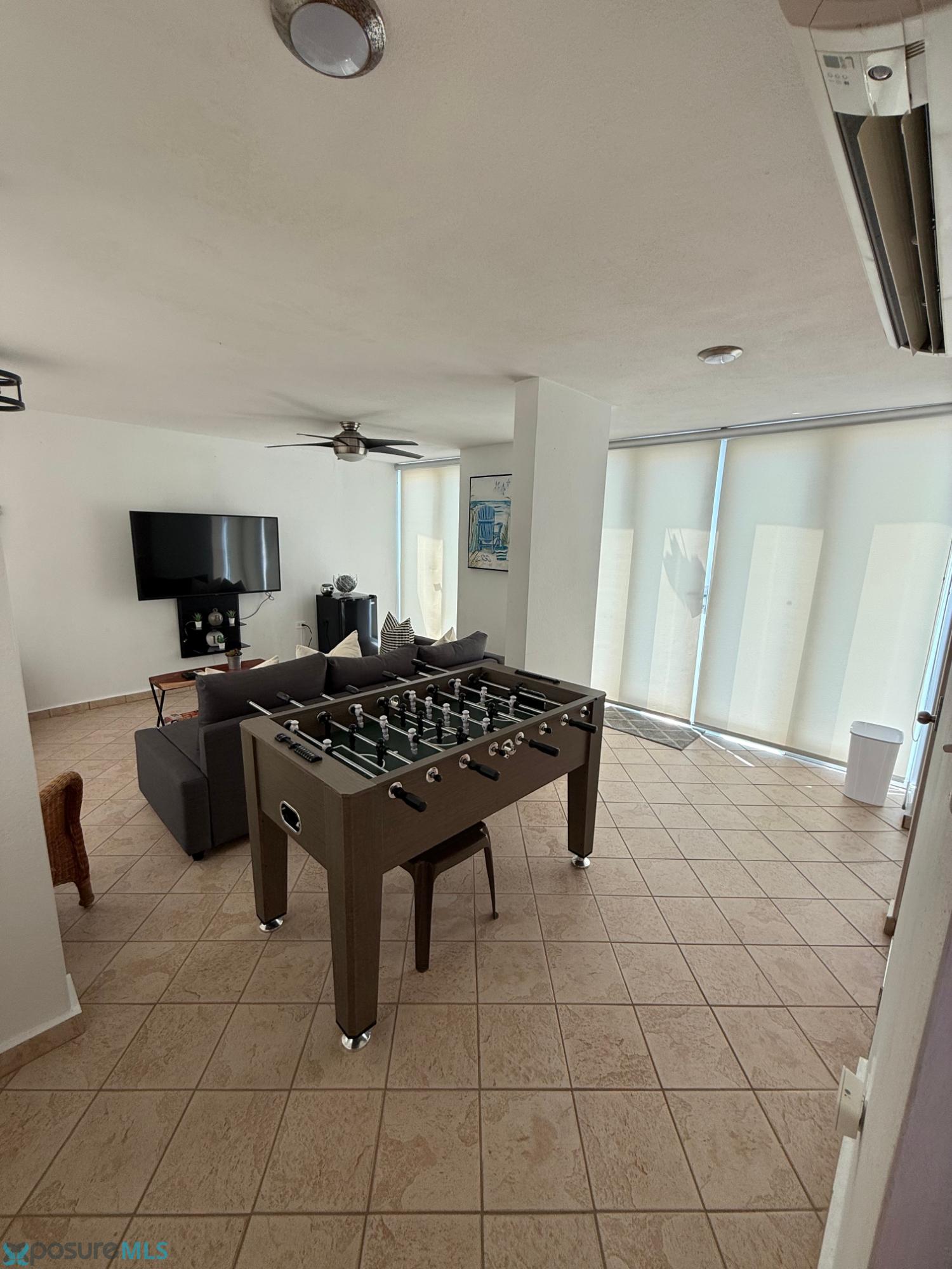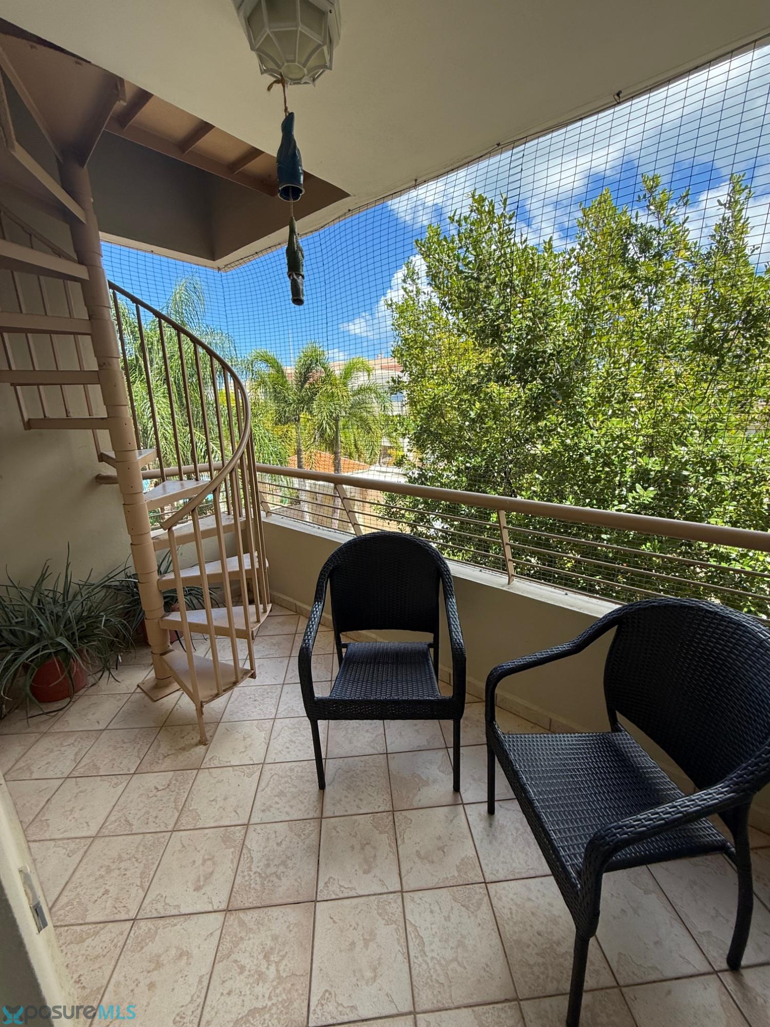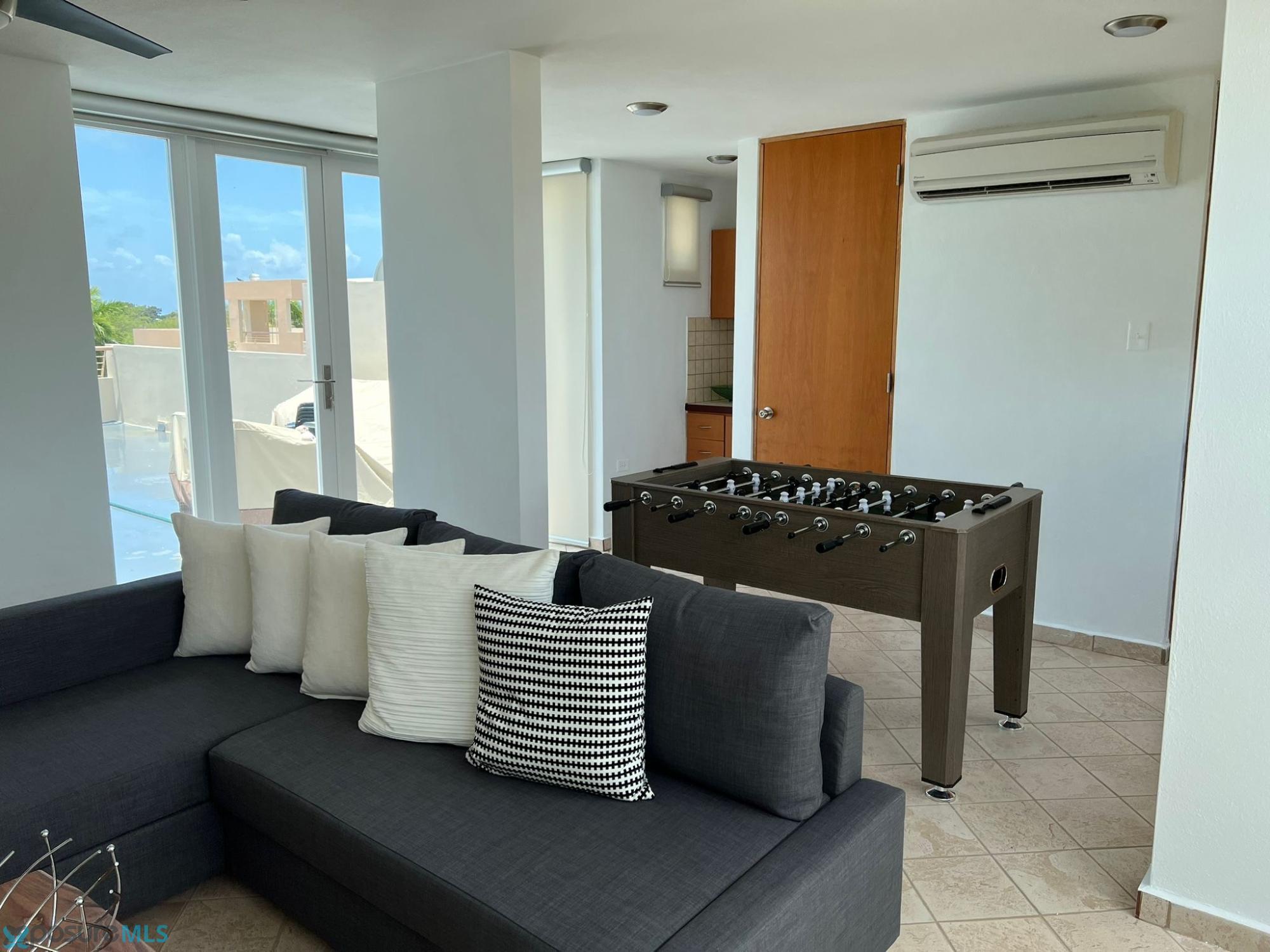 This beautiful two-story penthouse apartment is available for rent. It features a living room, dining room, modern kitchen, two bedrooms, two and a half bathrooms, a laundry area, and a balcony with a spiral staircase leading to the second floor. The second floor includes a family room/game room, a half bathroom, a small kitchen cabinet with a sink, another balcony, and a spacious open terrace with a great view of the complex and common areas. This penthouse apartment can be rented furnished or unfurnished. It comes equipped with air conditioning in all bedrooms, the living room, kitchen, dining room, and family room, as well as ceiling fans and light fixtures. Included items are a stove, refrigerator, microwave, living room set, dining room set, bedroom sets, sofa bed, and TVs. A beautiful place to live. Located in Condominio Paseo del Faro, Carretera 301 km 7.3, Combate..